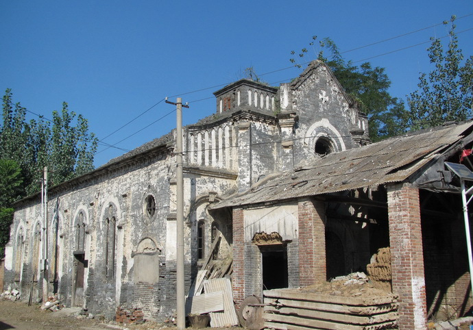 太和莊天主教堂 太和莊天主教堂,創(chuàng)建于民國(guó)三年(1914年),解放后即棄置不用。坐北朝南,是一座法國(guó)天主教教堂建筑,是房山區(qū)最早建立的教堂,也是房山區(qū)唯一一座保存基本完整的未經(jīng)拆改的教堂。面闊三間,進(jìn)深六間。山墻頭一間兩側(cè)開(kāi)券門(mén)。板瓦頂清水脊。堂內(nèi)有兩排八角磚柱。盡頭設(shè)石供桌,現(xiàn)已無(wú)存。