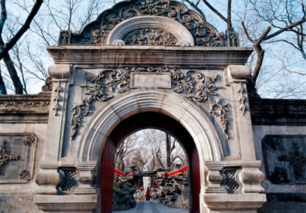 位于花園中路最南端,是花園的正門,稱“靜含太古”,為奕訢所建。門由漢白玉石雕砌,形制仿圓明園中大法海園門所建,西洋拱式風(fēng)格。門額外刻“靜含太古”,內(nèi)刻“秀挹恒春”,西洋門也是園內(nèi)唯一的西式建筑,可以體現(xiàn)出主人希望通過(guò)學(xué)習(xí)西方文化和技術(shù)來(lái)挽救清朝統(tǒng)治之意。這也是恭王府的三絕之一,另兩絕是大戲樓和后罩樓。