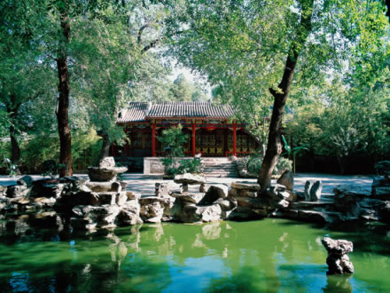 西路的方塘,面積約有2000平方米,是王府花園里最大的水域。有亭翼然立于湖心之中,雕梁畫棟,滿繪彩畫,船型的木橋與岸邊相接。粉色的荷花亭亭玉立,與大如華蓋的翠綠的荷葉交相輝映。戲水的白鵝,時(shí)時(shí)躍出水面的金魚(yú),打破了水面的平靜。此情此景,令人恍若置身于仙境之中。