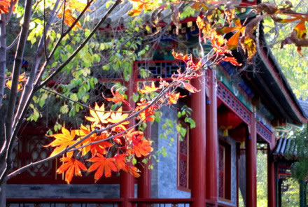 中路的蝠池,形似蝙蝠,汪汪一碧。春天到來(lái)的時(shí)候,池子周邊的榆樹(shù)結(jié)滿成串的“榆錢”,紛紛落入水中。這蝙蝠的“蝠”和榆樹(shù)的“榆”合起來(lái),就是“富!钡闹C音。“圖必有意,意必吉祥”在造園中得到了靈活充分的運(yùn)用。