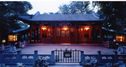 又稱蝠殿、蝠房子,位于花園中路最北端。建筑正廳五間,前后出抱廈三間。兩側(cè)又出耳房,四面出廊,形制多變,如蝙蝠兩翼。耳房比正廳略前,形成曲折對(duì)稱類似蝙蝠的平面,故名蝠廳。