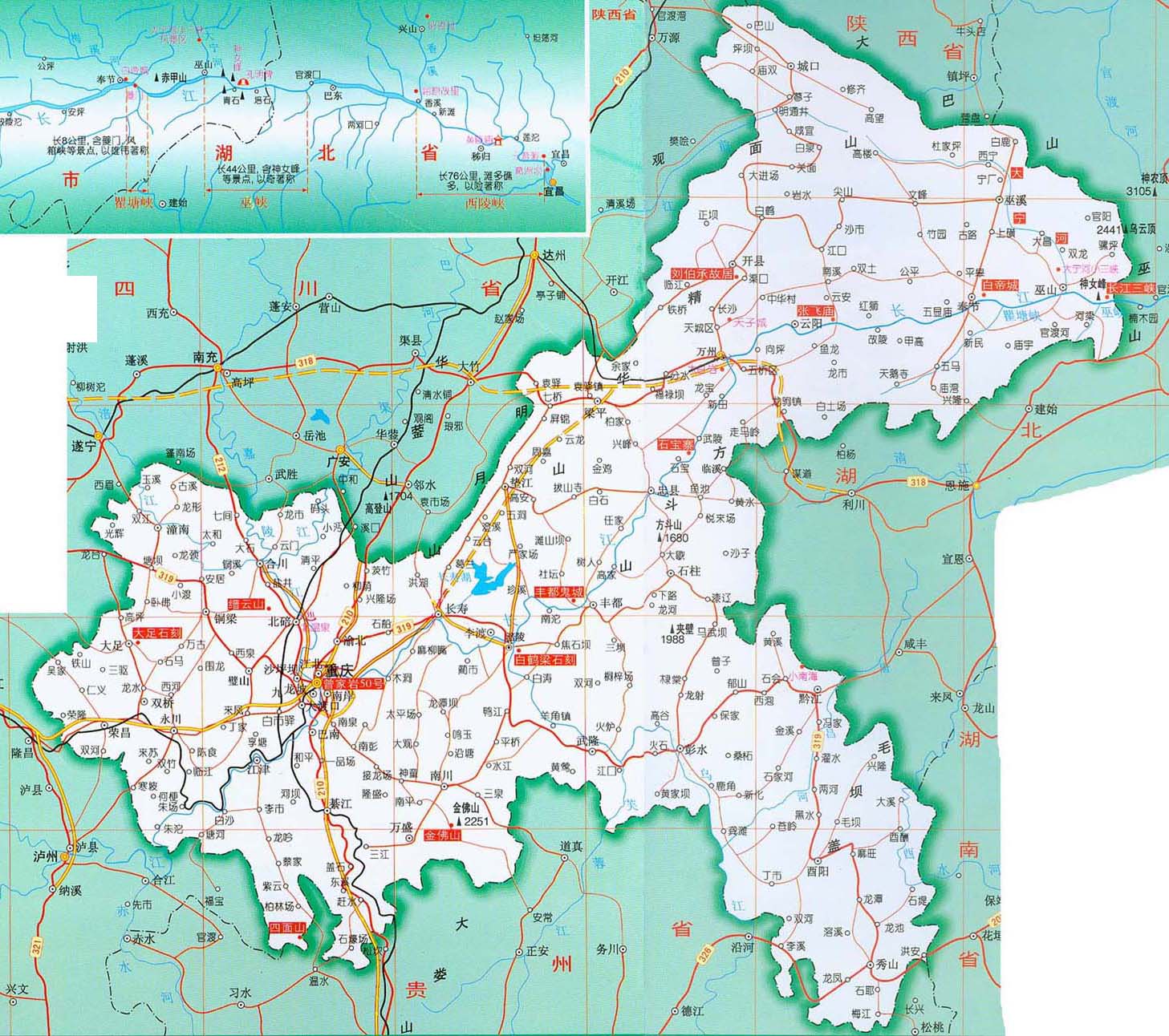 長(zhǎng)江斜貫本市,形成著名的長(zhǎng)江三峽。中亞熱帶濕潤(rùn)季風(fēng)氣候,年降水量1000毫米以上。冬暖夏熱,夏季因地形郁悶,氣候悶熱,成為長(zhǎng)江三大“火爐”之一。