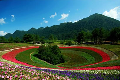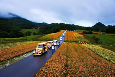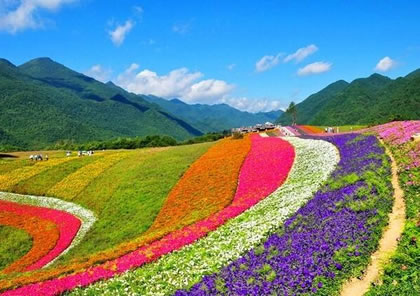 嫣彩織帶:各色鮮花呈帶狀鋪滿,五顏六色,艷麗斑駁。一條條彩帶猶如多條絲綢鋪展在草地上,在綿延起伏的山脈下形成一片彩色的海洋。近百畝的帶狀簡(jiǎn)單構(gòu)圖,鋪天蓋地的霸氣給人豐富遐想,更像一條巨大的飄帶,給景區(qū)增加色彩的壯麗與斑斕。