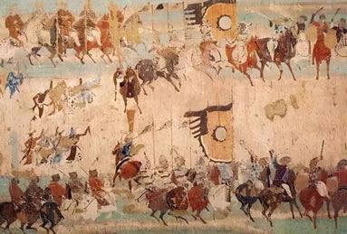 敦煌作為中西交通的樞紐,在壁畫上不僅留下了商旅來往的活動(dòng)情況,還留下了寶貴的交通工具的形象資料。他們有牛馬駝騾、驢象舟船、車轎輿輦等。常用的交通工具車輛類型各異,牛車有“通牛車”、“偏牛車”、敞篷牛車,馬車有駟車、駱車,還有駱駝車、童車、獨(dú)輪車等,特別是保存了中國為世界交通做出獨(dú)有貢獻(xiàn)的獨(dú)輪車、馬套挽具(胸帶挽具和肩套挽具)、馬蹬、馬蹄釘掌等珍貴的圖像數(shù)據(jù)。西魏第285窟、北周第296窟五百盲賊皈依故事畫,表現(xiàn)了騎著戰(zhàn)馬的騎兵,與身穿褲褶的步兵(強(qiáng)盜)作戰(zhàn)的場面,畫面上畫出了馬鎧,它是保護(hù)戰(zhàn)馬的防護(hù)裝備,古稱具裝,或具裝鎧。第285窟馬鎧的形制齊全,從保護(hù)馬頭的“面簾”、到保護(hù)馬鞍后尻部的“寄生”一應(yīng)俱全。反映了漢代已有的具裝,到北朝時(shí)期已發(fā)展為玩唄成熟的保護(hù)裝備。馬鎧的產(chǎn)生和發(fā)展是中國為世界軍事裝備所作的獨(dú)有貢獻(xiàn)。