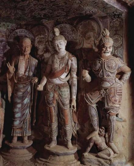 (1)早期——發(fā)展期,包括十六國、北魏、西魏、北周四個(gè)時(shí)代,歷時(shí)一百八十年。早期洞窟形制有三:1.禪窟,塑像在正龕。2.方形或長方形殿堂窟,塑像置于正龕或南北壁列龕內(nèi)。3.中心柱窟,塑像置于長方形柱四面之龕內(nèi)。從佛像類別上分,有彌勒像、釋迦像和釋迦多寶并坐像,以表現(xiàn)的事態(tài)分,有說法像、禪定像、思惟像。中心柱四面多為苦修、禪定、降魔、成道等像,主尊兩側(cè)多有侍從菩薩,形成一佛二菩薩的格式。早期彩塑多以彌勒為主尊,這與當(dāng)時(shí)傳自西域的彌勒信仰有密切關(guān)系。