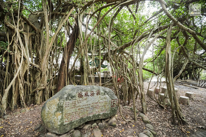 竹山古榕部落由一棵一千三百多年的古榕和眾多小葉榕組成。古榕為高山榕,榕樹高大挺拔,樹干需十三個(gè)成人張開雙臂才能合抱。而這一株株榕樹,也許是海風(fēng)終年吹拂的緣故,榕樹長(zhǎng)到一定高度后就橫向生長(zhǎng),長(zhǎng)出許多氣根,氣根接觸地面后長(zhǎng)成一根根枝干,這樣的氣根不知多少,數(shù)不勝數(shù),遠(yuǎn)遠(yuǎn)望去,一株榕樹就是一片樹林,在綠茵如水的野芋叢中,構(gòu)成了“頃地一古榕,飛瀑掛潭中”的佳景,打造了古榕部落“雙龍出海”、“四郎探母”、“六柱擎天”、“八仙會(huì)聚”以及榕樹瀑、榕樹墻、榕樹戀、榕樹侶等惟妙惟肖的生態(tài)奇觀。