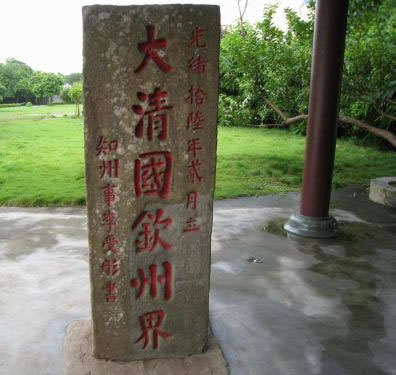 大清國(guó)一號(hào)界碑位于北侖河出?诘男∩狡律,碑高1.7米,寬0.7米,厚0.4米,用沿海所產(chǎn)的海蝕巖鑿成。界碑正面書“大清國(guó)欽州界·知州李受彤書·光緒十六年二月立”,涂著紅漆的莊嚴(yán)雄渾的大楷碑文透著一股不可侵犯的凜然正氣。這塊飽受長(zhǎng)年風(fēng)吹日曬雨淋而益顯滄桑的巨石,一直昂揚(yáng)地巍然屹立著,向每一個(gè)游客訴說著100多年來的每一段歷史。