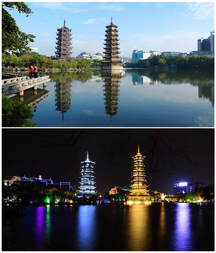 日月雙塔地處桂林市中心區(qū),坐落在桂林城的中軸線(xiàn)上,與“象山水月”相鄰。象山是桂林的城徽,而雙塔則是新桂林的標(biāo)識(shí)。日塔、月塔與象山上的普賢塔、塔山上的壽佛塔,相互呼應(yīng),相互映襯,有“四塔同美”之說(shuō)。桂林日月雙塔號(hào)稱(chēng)世界第一銅塔,是桂林旅游的一個(gè)夜景觀(guān)賞地。