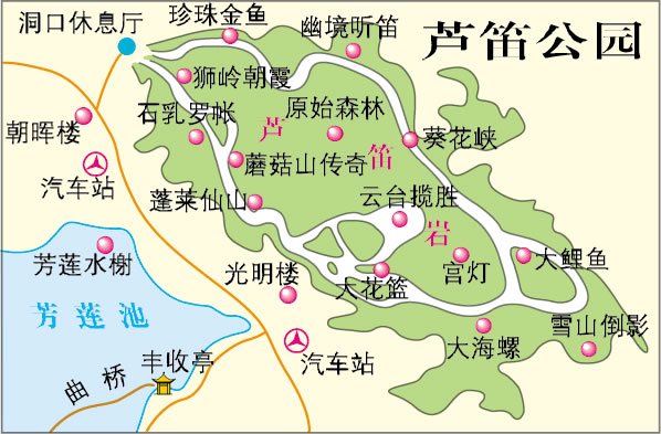 蘆笛巖是整個漓江風景名勝區(qū)的重要組成部分,1959年籌建,1962年開放,1982年11月成為國務院頒布的第一批國家重點風景名勝區(qū)。它擁有大自然賦予桂林山水清奇俊秀的巖溶風貌。蘆笛巖洞深240米,游程500米。約70萬年前,因地下水沖刷和溶蝕,含碳酸鈣的滴水、流水與積水,因水分揮發(fā),二氧化碳重新沉淀,形成了千姿百態(tài)的鐘乳石奇觀。自洞頂垂下的叫石乳,自地上向上生長的叫石筍,石乳與石筍連接成石柱、石幔、石枝、石花、石瀑等;一些石頭中空,敲擊時發(fā)出的聲音清越入耳,又稱石琴、石鼓、石鐘;回乳石中含方解石微粒,在洞內(nèi)五彩燈光的映照耀反光,便形成"鉆石山"、"高峽飛瀑"等奇觀。