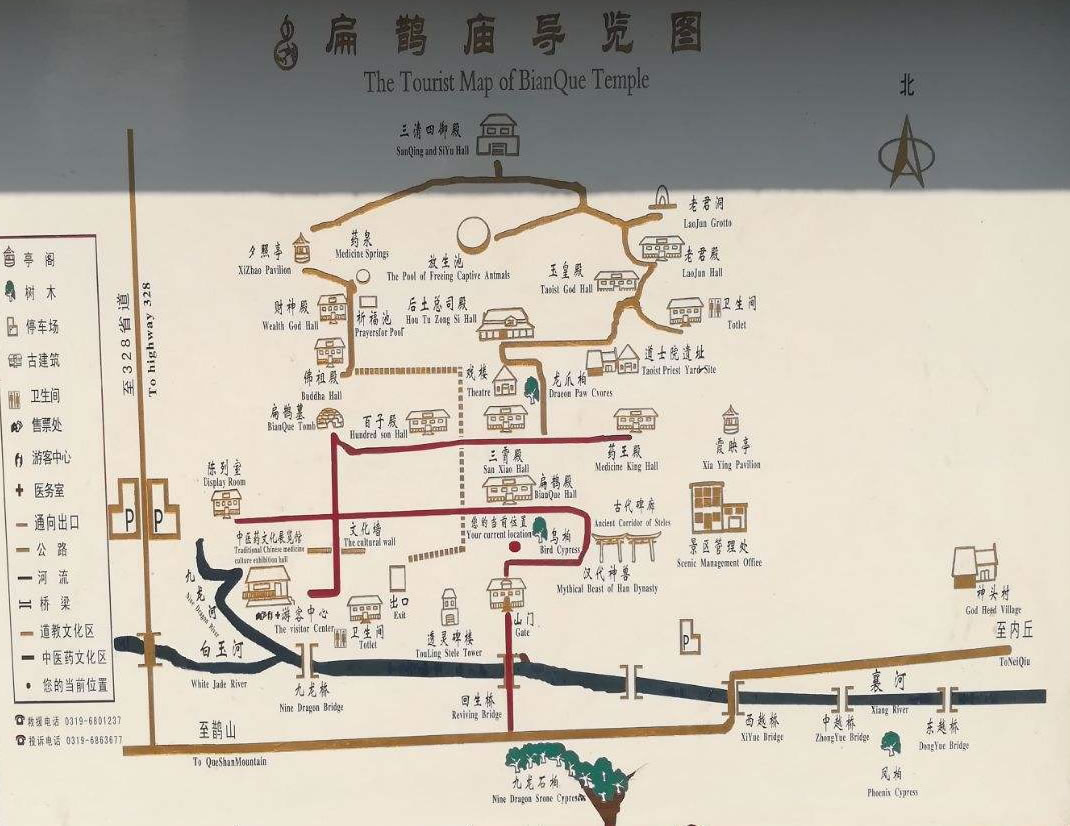 扁鵲廟古建筑群處在群山環(huán)抱之中,廟殿布局嚴謹,木石結(jié)構(gòu),描梁畫棟,奇脊飛檐,紅磚綠瓦?傮w呈長方形,按天(玉皇)、地(后土)、人(扁鵲)三才布局,F(xiàn)存有回生橋、山門、扁鵲殿、后土總司殿、玉皇殿、三清殿、老君殿、財神殿百子殿、三霄殿、藥王廟等19座,占地面積15萬平方米,以扁鵲廟為中心形成了龐大的古建筑群,總體布局合理,結(jié)構(gòu)緊湊;是北方典型的道教廟群。其中扁鵲殿、扁鵲墓、透靈碑、回生橋、九龍柏、古代碑廊、三清殿、漢代神獸,為扁鵲廟八大景觀。
