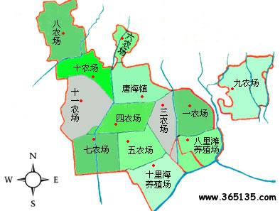 唐?h轄1個(gè)鎮(zhèn)、11個(gè)農(nóng)場(chǎng)、2個(gè)養(yǎng)殖場(chǎng):