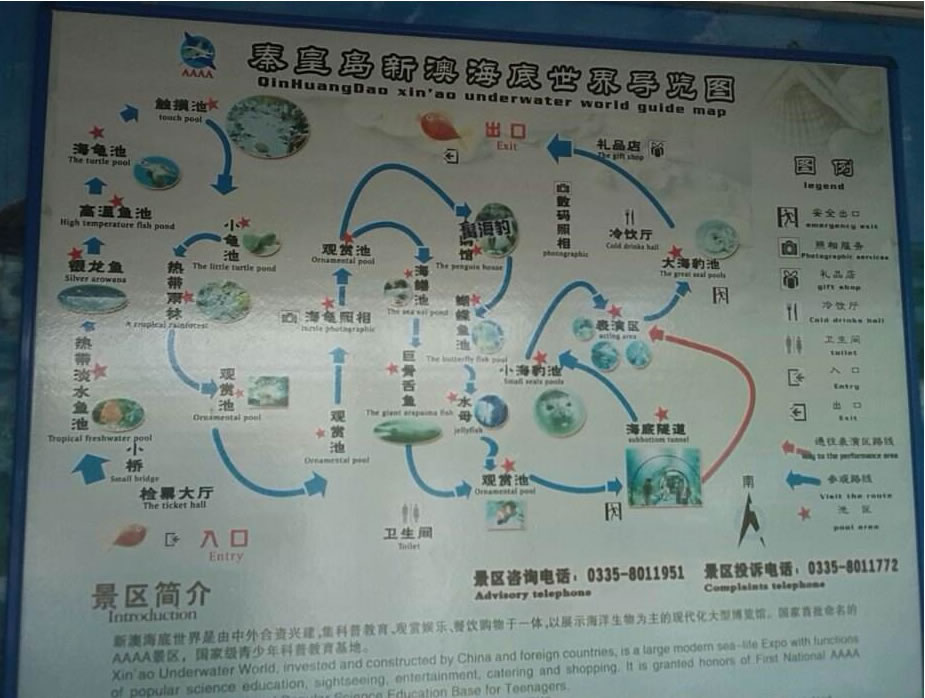 秦皇島火車站有公交車可直達(dá)景區(qū)。一期工程總投資人民幣1. 2億元,建筑面積1.3萬平方米,總儲(chǔ)水量約500.0000立升。主要由小池區(qū)、江豚龍宮、觸摸池、珊瑚海、雨林傳奇、企鵝館、海豹表演、海底探奇、深海之旅、科普展廳、科普教室、鳥雨林、巨蟲公園及海洋精品店、觀海鱷魚餐廳 等部分組成是集科普教育、環(huán)保教育、休閑娛樂于一體的科普教育基地。