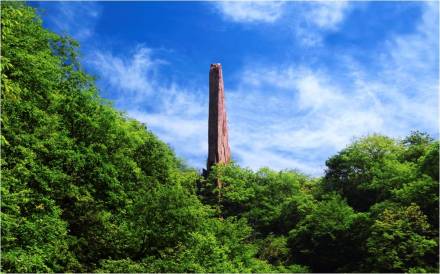 天碑高達(dá)50余米,是一個(gè)巨型崩塌巖塊。由于崩塌時(shí)的位移,原來近水平產(chǎn)出的巖層此時(shí)呈直立狀,巍然聳峙在峽谷一側(cè),高大雄偉、氣勢恢弘,一景多變,步移景換,從不同角度仰望,或蒼鷹、或飛鳥、或飛魚、或刀背、或天碑,大自然賦予其無限美感。傳說,這本是二郎神斬殺小白龍的大刀,圣母媧皇在安置了小白龍神位之后,又把二郎神丟下的大刀豎立起來,刀背對著無頭冤神洞,于是二郎神斬殺小白龍的大刀,成了紀(jì)念小白龍的無字碑,人們稱其為“擎天刀碑石”。