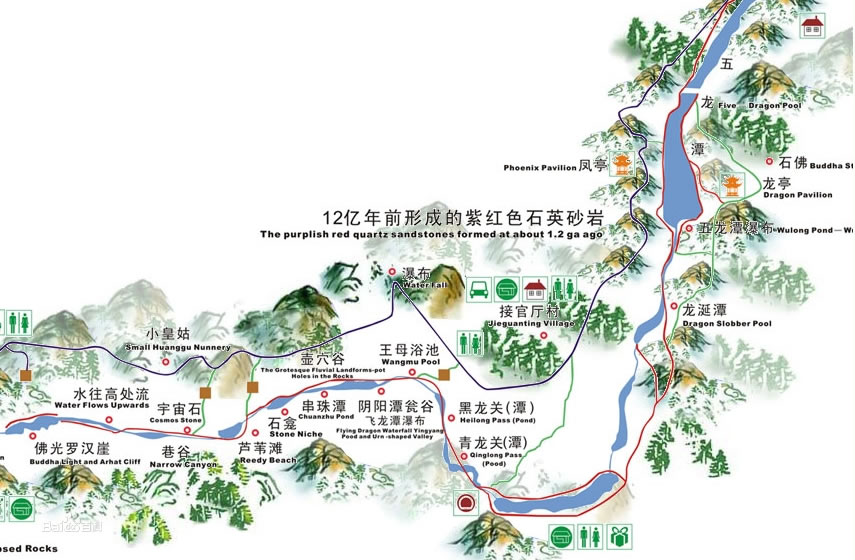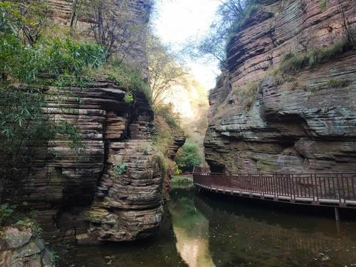 紅巖絕壁,飛瀑幽潭,狹溝深谷,奇石綠蔭,組成世界上罕見的山水畫廊。