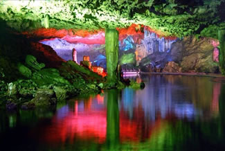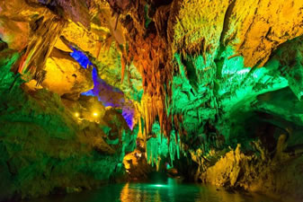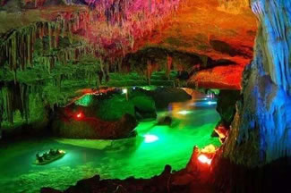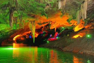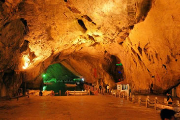 通往水洞的碼頭,千余平方米的水面,宛如一幽靜別致的“港灣”,燈光所及,水中游船、洞中石景倒映其中,使人如入仙境。從護(hù)岸石階拾級(jí)而下,通過長廊從碼頭上船,即可暢游水洞。水洞全長5800米,現(xiàn)已開發(fā)2800米,面積3.6萬平方米,空間40余萬立方米,最開闊處高38米,寬70米。