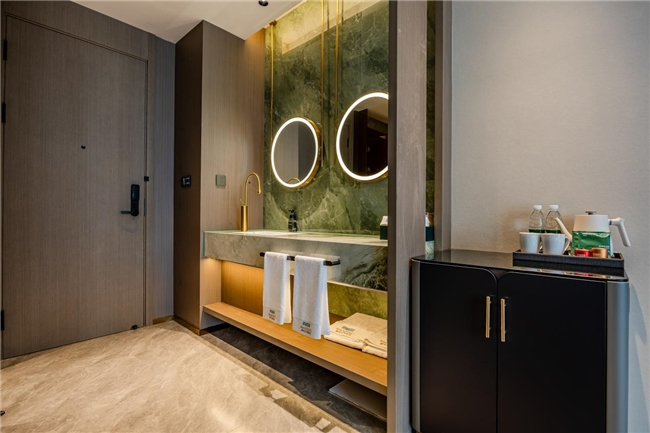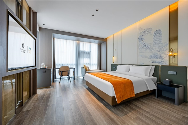 客房方面,酒店設(shè)有多元客房,涵蓋大床房、雙床房、家庭房及豪華套房,滿足不同客人的入住需求。房間內(nèi)配備全景落地窗、智能客控系統(tǒng)、電視投屏功能、品牌床墊、中央空調(diào)等設(shè)施一應(yīng)俱全,營(yíng)造出舒適溫和的氛圍,讓客人在淡泊素雅的藝術(shù)氣息中,感受到 "酒店不只是一張床,更是路上最溫暖的港灣,是在繁華喧鬧中回歸自我的慢生活"。