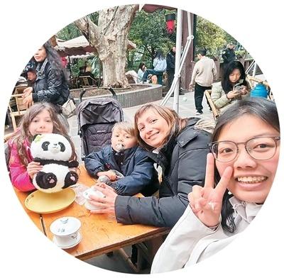 馮燕(右)與外國(guó)游客在鶴鳴茶社合影!∈茉L者供圖