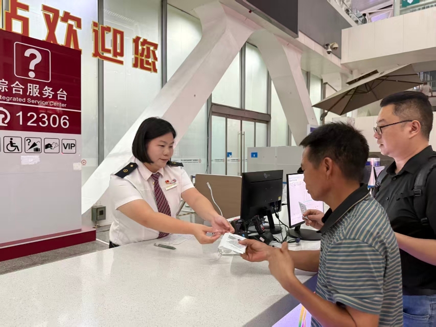 廣州南站綜合服務(wù)臺工作人員為旅客辦理業(yè)務(wù),提供12306一站式服務(wù)