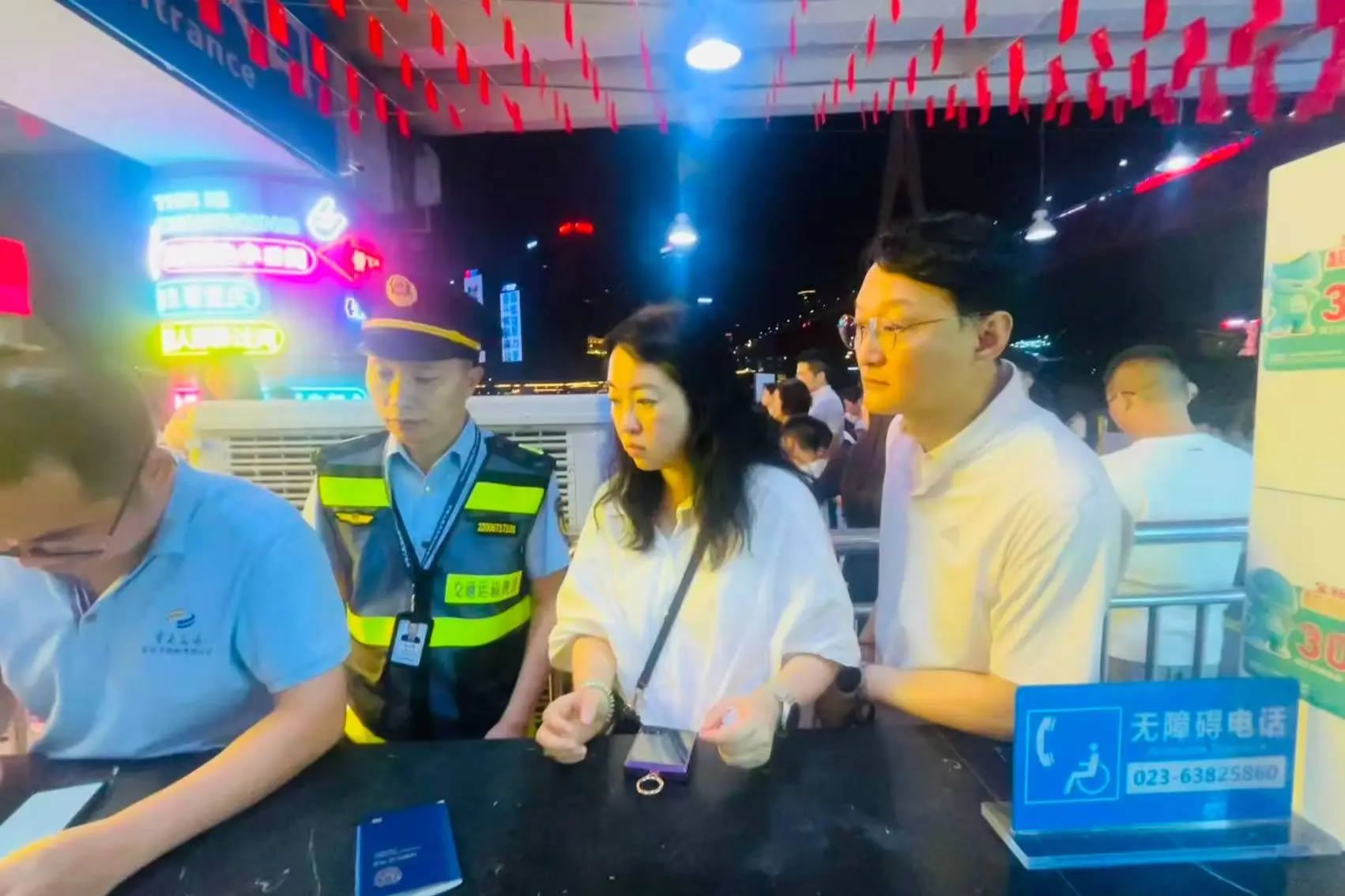 10月5日晚,兩名韓國游客因手機損壞無法出示購票信息,向洪崖洞客運碼頭兩江游執(zhí)法服務站求助。執(zhí)法人員一邊安撫游客,一邊協(xié)調(diào)技術人員通過后臺系統(tǒng)查詢,不到5分鐘便幫助游客順利登船。這一高效處置展現(xiàn)了服務站“事企聯(lián)動”機制的優(yōu)勢,也為外國游客留下了美好的重慶印象。