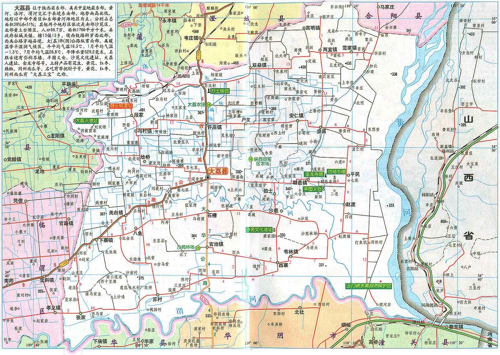 大荔縣位于關(guān)中平原東部,是黃 、洛、渭三河匯流之地。南界渭河與潼關(guān)、華陰、華縣為鄰,西繞洛河與蒲城、臨渭區(qū)毗連,北沿臺(tái)塬與澄城、合陽縣接壤,東瀕黃河與山西永濟(jì)相望,素有"三秦通衢"、"三輔重鎮(zhèn)"之稱。大荔縣總面積為1776.1平方公里,全縣轄7鎮(zhèn)26鄉(xiāng),414個(gè)行政村??cè)丝?2萬人。