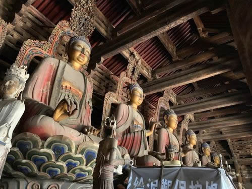 觀音閣內(nèi)中央的須彌座上,聳立著一尊高16米的泥塑觀音菩薩站像,菩薩頭部直抵三層的樓頂。因其頭上塑有十個(gè)小觀音頭像,故又稱之為“十一面觀音”,菩薩面容豐潤(rùn)、慈祥,兩肩下垂,軀干微微前傾,儀態(tài)端莊,似動(dòng)非動(dòng)。觀音塑像兩側(cè)各有一尊脅侍菩薩塑像,塑像是遼代的原塑,雖制作於遼代,但其藝術(shù)風(fēng)格類似盛唐時(shí)期的作品,是我國(guó)現(xiàn)存的最大的泥塑佛像之一。