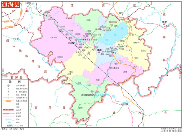 位置境域 通?h地處云南省中南部、玉溪市東部,東與華寧縣接壤,西與峨山縣、紅塔區(qū)相鄰,南與紅河州石屏縣、建水縣交界,北與江川區(qū)毗鄰。東西最大橫距39.97千米,南北最大縱距36.15千米,總面積721平方千米。距云南省會昆明市125千米,距玉溪市政府所在地紅塔區(qū)47千米。