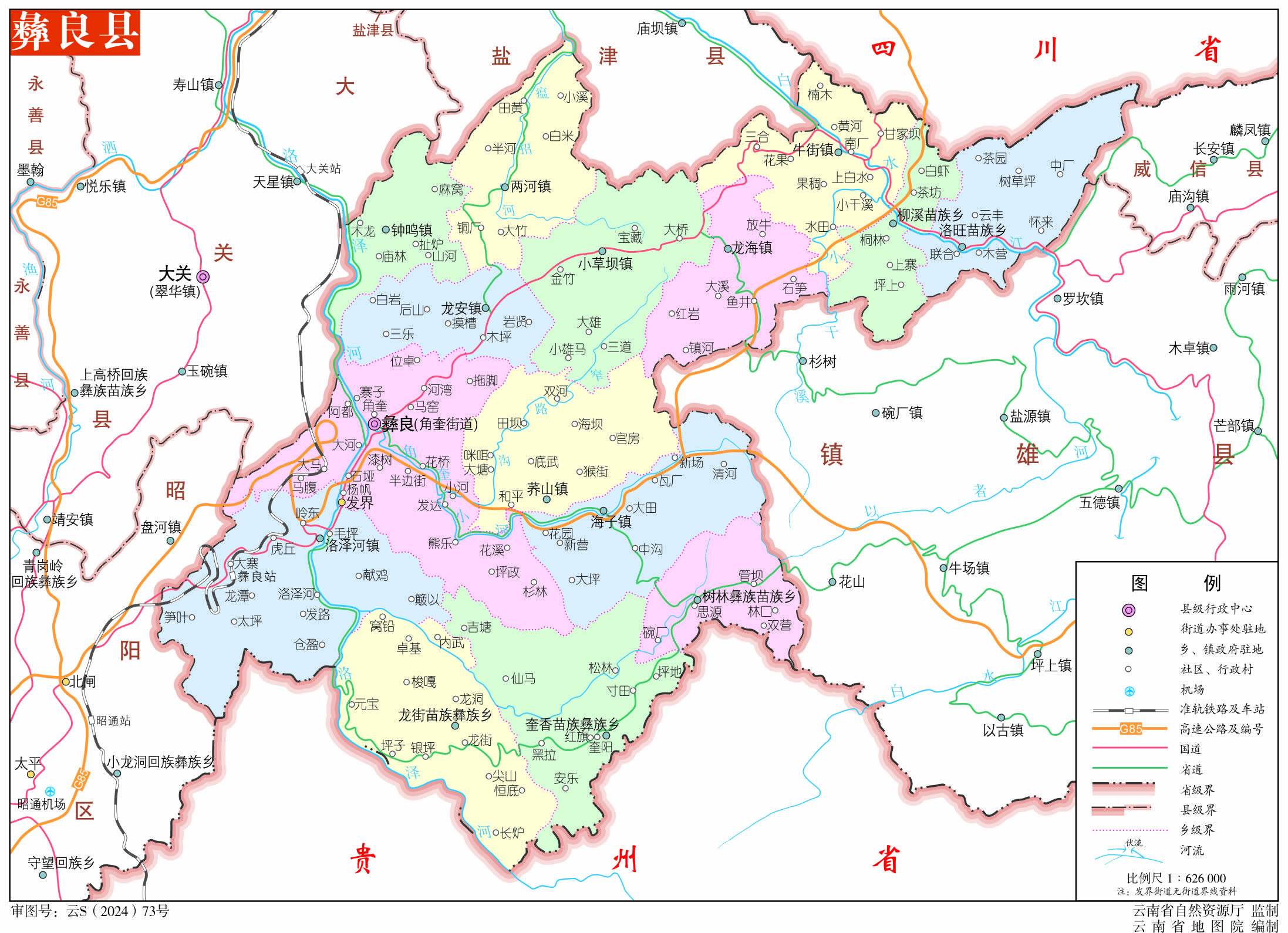 鎮(zhèn):牛街鎮(zhèn)、洛澤河鎮(zhèn)、海子鎮(zhèn)、蕎山鎮(zhèn)、龍安鎮(zhèn)、兩河鎮(zhèn)、鐘鳴鎮(zhèn)、小草壩鎮(zhèn)、龍海鎮(zhèn)