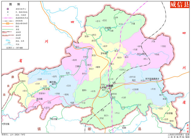 位置境域 威信縣,位于云南省最東北端、昭通市東北部。東與四川敘永縣接壤,東南角與貴州七星關(guān)區(qū)隔河相望,南連鎮(zhèn)雄縣,西接彝良縣和四川筠連縣,北與四川珙縣、興文縣毗連。東西寬57千米,南北長(zhǎng)36.6千米,總面積1397.64平方千米。