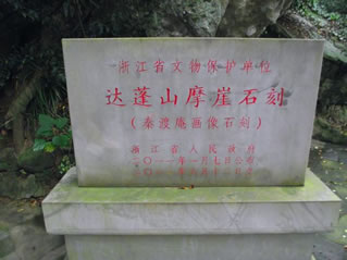 摩崖石刻是后人為緬懷徐福東渡這一歷史事件而保存下來的歷史古跡,大約刻于唐宋間,故而十分珍貴,具有極高的歷史研究價值。石刻面朝東南,高1.2米,寬3.5米,整幅畫面展現(xiàn)“人馬步金橋”、“鯉魚跳龍門”、“麟鳳呈祥瑞”等場面,表現(xiàn)了徐福率童男童女從達蓬山東渡出海的史實,也是全國唯一幸存的反映徐福東渡的歷史古跡。清康熙庚子年僧人惠初游覽達蓬山時,在其中挖了神龕,并刻有“靈臺自若”等字樣。
