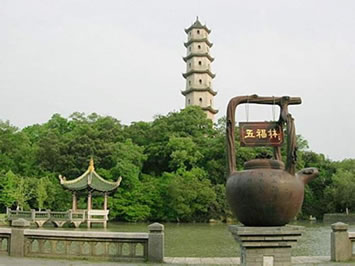 西塔始建于北宋開寶二年(969年),一說建于唐咸通十年(869年),明、清曾多次修繕。塔高32米,底徑7米,6邊形,7層,中空,系樓閣式青磚仿木構(gòu)建筑。遠(yuǎn)遠(yuǎn)望去,碧水藍(lán)天,全身披綠的西峰山托著磚紅色寶塔,塔剎直入云端,蔚為壯觀。就近處,江風(fēng)吹動四十二個檐角的銅風(fēng)鈴送聲,四周枝頭飛禽清脆的啼嗚,交響成趣。塔每層每面均有小佛龕,內(nèi)置石雕佛像,造型精致,神態(tài)自然,有頗高的藝術(shù)價值,塔周圍置青石坐凳,萬木扶疏。因塔身傾斜,曾于1982年進(jìn)行大修葺。今塔仍保持宋代風(fēng)格。